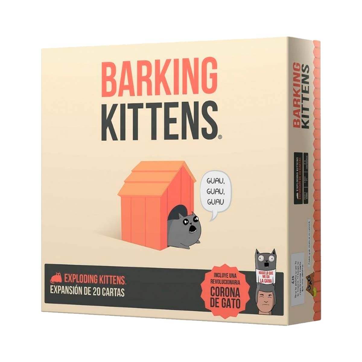Barking Kittens es la tercera expansión de Exploding Kittens. Nuevas cartas con nuevas acciones y características poderosas y una corona de gato que te protege de que el resto de jugadores te robe.