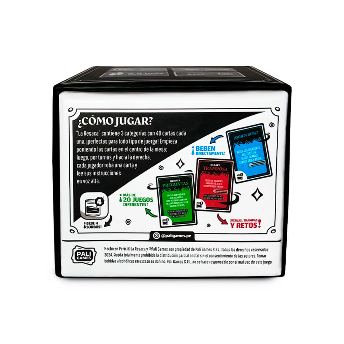El juego contiene 120 cartas con 3 categorías donde encontrarás más de 20 mini-juegos distintos, muchos retos y divertidas reglas que harán inolvidables cada una de tus juergas. Empieza poniendo las cartas en el centro de la mesa; luego, por turnos y hacia la derecha, cada jugador roba una carta y lee sus instrucciones en voz alta.