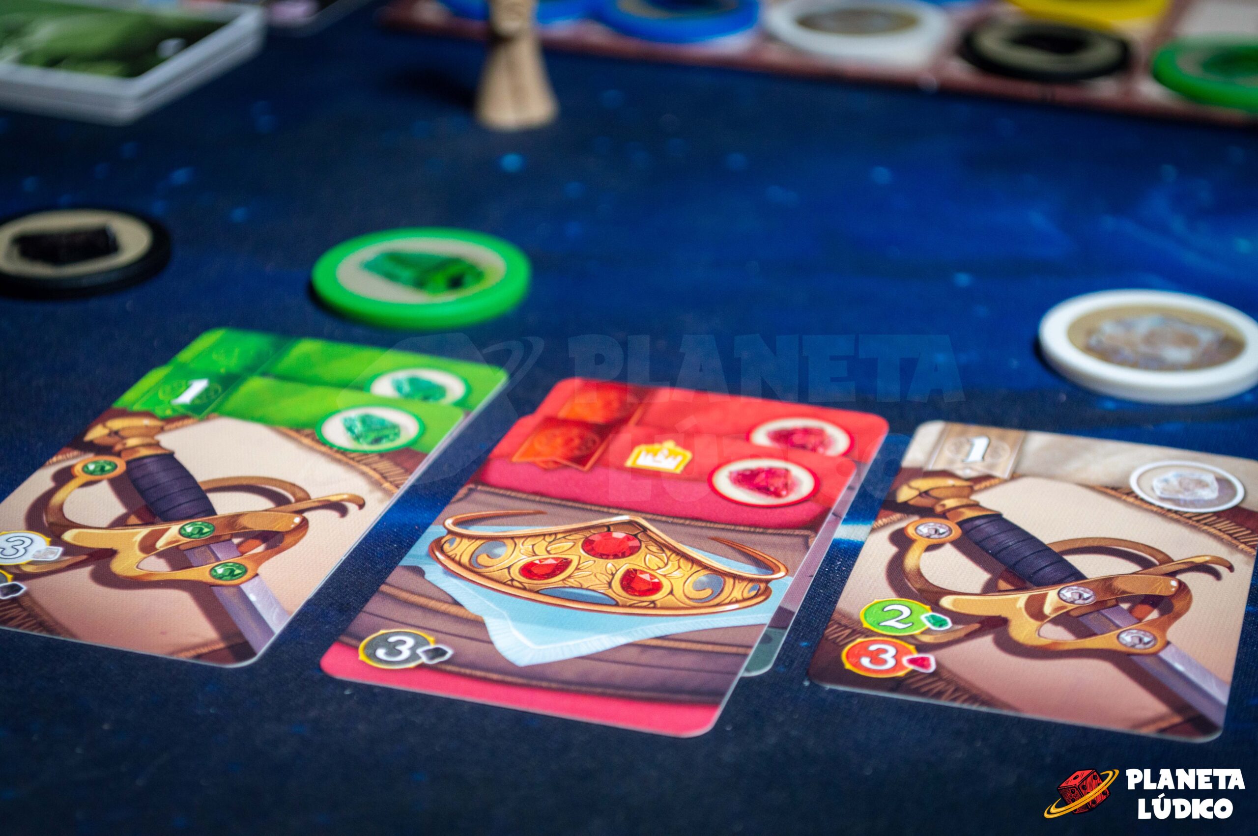 Enfréntate a tu gremio rival en una carrera por la victoria. Toma fichas de Gema y de Perla del tablero común y, a continuación, compra cartas y acumula bonificaciones, favores reales y Prestigio.