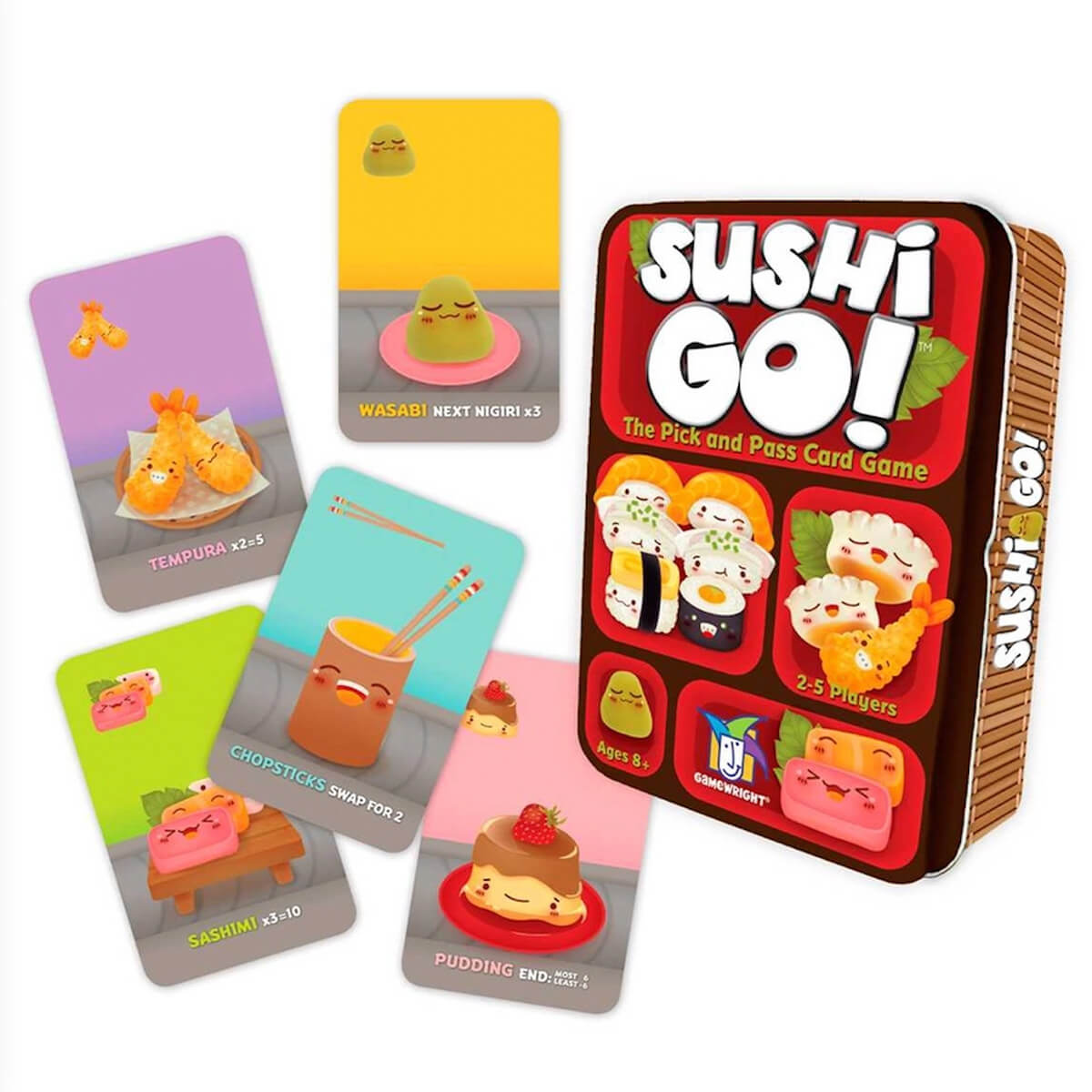 ¡Pasa el sushi! En este rápido juego de cartas, el objetivo es atrapar al vuelo la mejor combinación de platos de sushi. Puedes ganar puntos si te comes mas makis que los otros o si reúnes un trío de sashimi. Moja tu nigiri favorito en salsa con wasabi y triplicarás su valor. Pero asegúrate de que te queda un rinconcito para el postre, ¡o si no te comerás tus puntos!¡Consigue más puntos que nadie y te sentirás el rey del sushi!